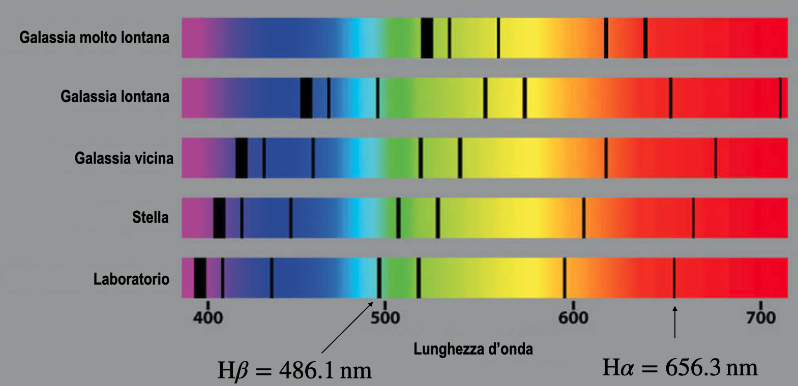 Fig. 1 – Esempi di spostamento verso il rosso nello spettro elettromagnetico ottico di oggetti cosmici. Le barre nere indicano le lunghezze d’onda tipiche di alcuni elementi chimici, come per esempio l’idrogeno. Il nero indica un assorbimento, mentre i vari colori indicano emissione. Come si può vedere, negli oggetti più lontani, le barre nere si spostano verso regioni più rosse. Adattata da: https://science8sc.weebly.com/redshift.html