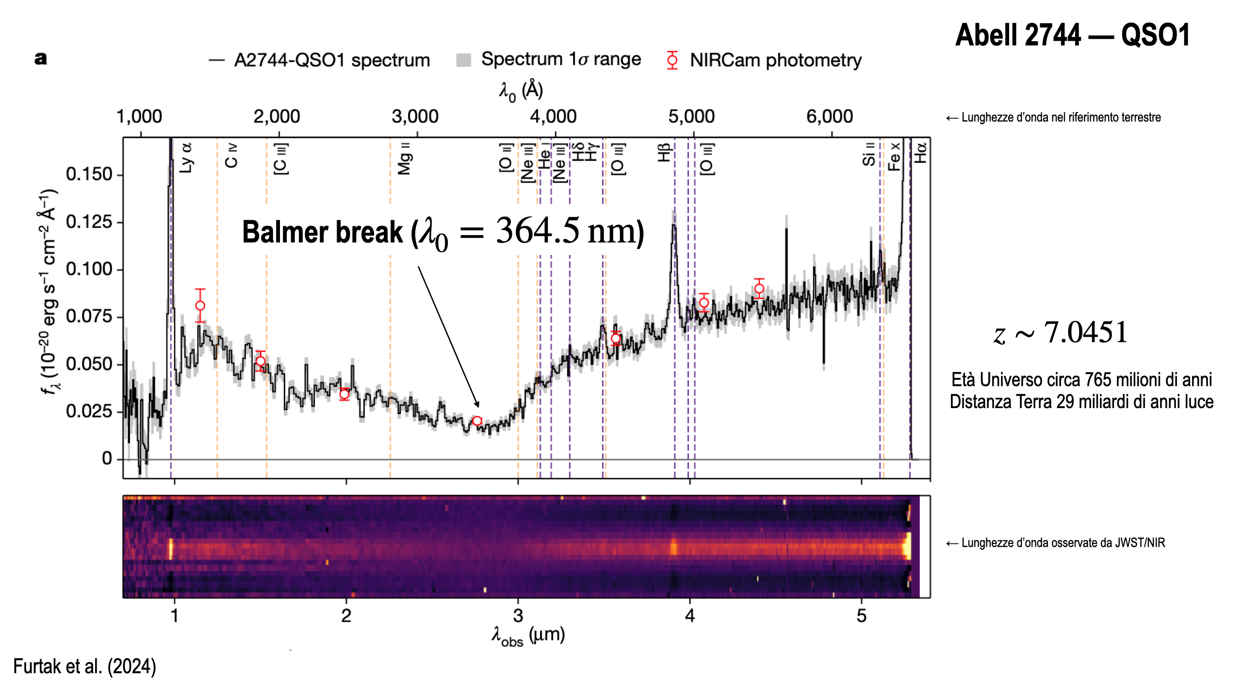 Questo oggetto si chiama Abell 2744 — QSO1 e ha un redshift di 7.0451. Notare la forma a V, indice della presenza del Balmer break (immagine adattata da Furtak et al. 2024 → https://ui.adsabs.harvard.edu/abs/2024Natur.628…57F/abstract).