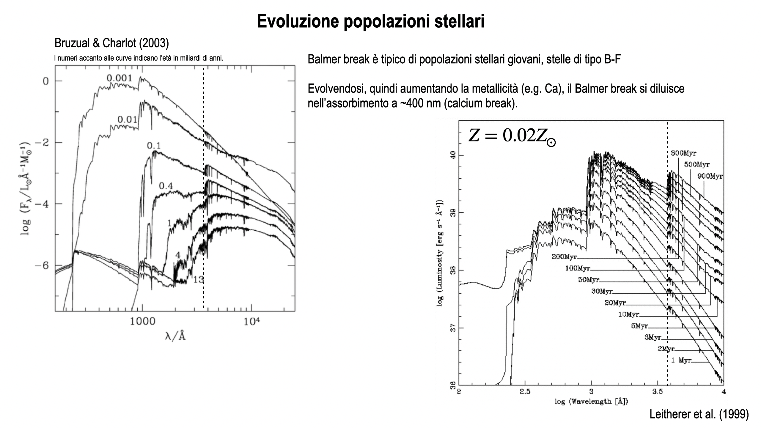 Fig. 3 - Evoluzione delle popolazioni stellari. Grafici adattati da Leitherer et al. (1999) [https://ui.adsabs.harvard.edu/abs/1999ApJS..123....3L/abstract] e Bruzual & Charlot (2003) [https://ui.adsabs.harvard.edu/abs/2003MNRAS.344.1000B/abstract].