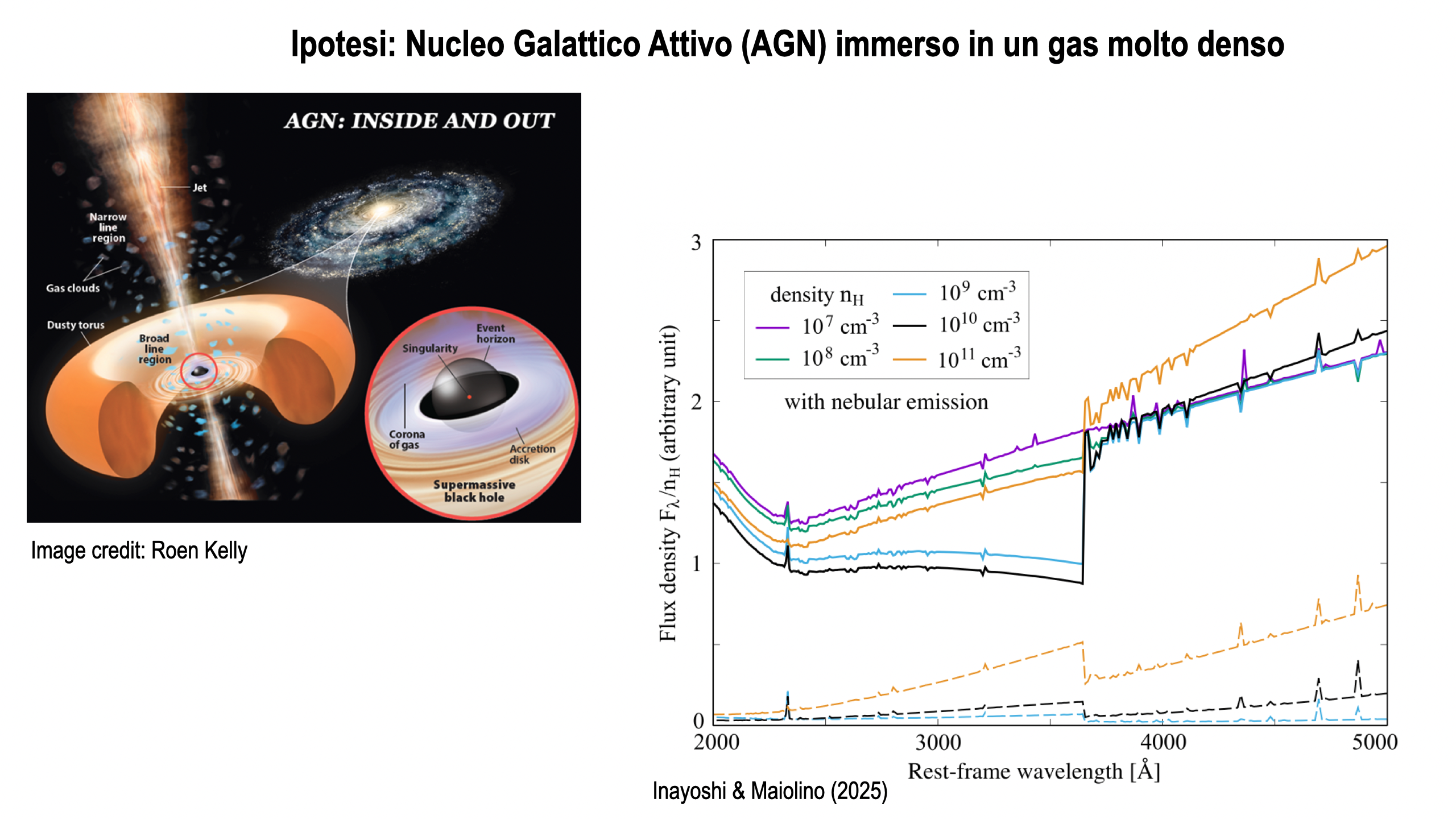 Una possibile soluzione è stata avanzata da Inayoshi & Maiolino (2025) [https://ui.adsabs.harvard.edu/abs/2025ApJ…980L..27I/abstract], che hanno proposto un modello basato su un nucleo galattico attivo (AGN) immerso in un gas molto denso. Un AGN è costituito da un buco nero supermassiccio (da milioni a centinaia di milioni di masse solari) che accresce materia distribuita in un disco equatoriale. Allontanandosi dal buco nero si incontra una regione di gas, chiamata regione delle linee larghe (broad-line region, BLR), perché emette linee con profilo allargato, indice di velocità orbitale di migliaia di chilometri al secondo. Procedendo sempre verso l’esterno, si incontrano una regione equatoriale di forma toroidale, composta di polvere e molecole di gas freddo, e poi una regione che emette linee strette (narrow-line region, NLR), con velocità orbitale di centinaia di chilometri al secondo. In alcuni casi, ci possono essere dei getti polari di materia espulsa a velocità prossime a quelle della luce (Fig. 4). Inayhoshi & Maiolino hanno costruito un modello usando un tipico AGN e avvolgendolo con una nube di gas di crescente densità. Hanno visto che per densità superiori a circa 10^9 cm^-3 la forma dello spettro ricalca quella forma a V dei LRD (Fig. 4).