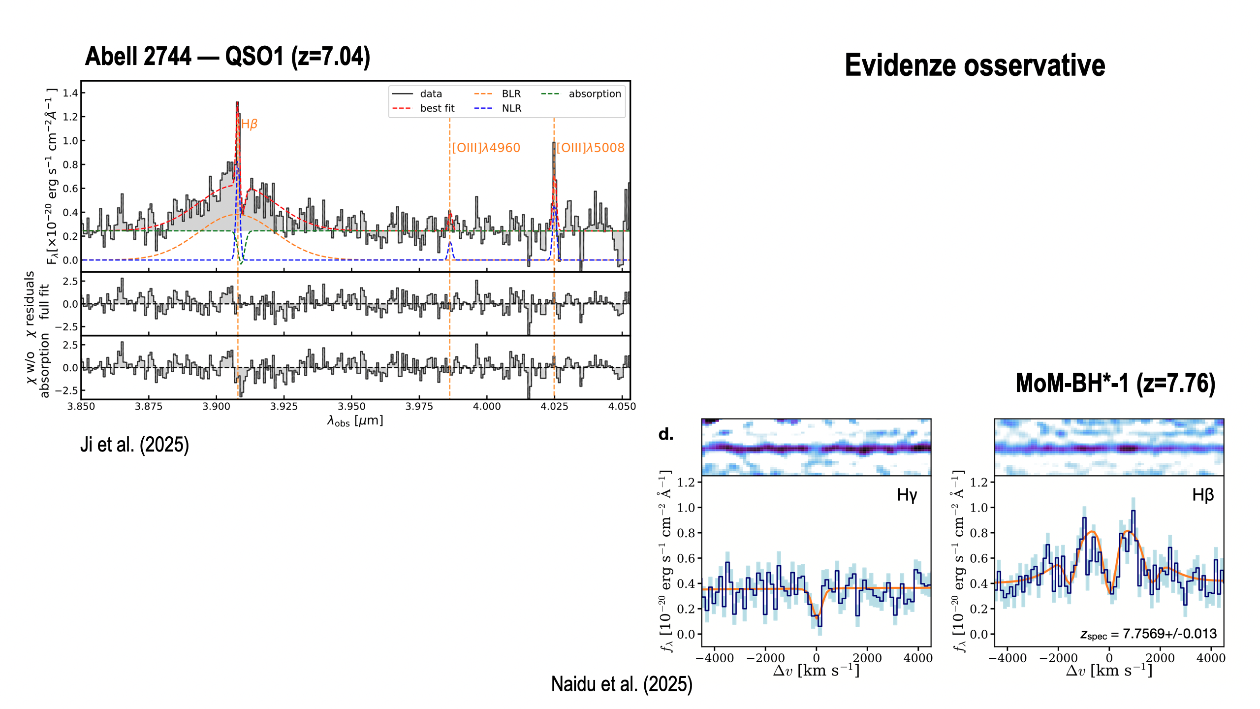 Fig. 5 – Evidenze osservative del modello di Inayoshi & Maiolino. Figure tratte da Ji et al. (2025) [https://ui.adsabs.harvard.edu/abs/2025MNRAS.544.3900J/abstract] e Naidu et al. (2025) [https://ui.adsabs.harvard.edu/abs/2025arXiv250316596N/abstract].