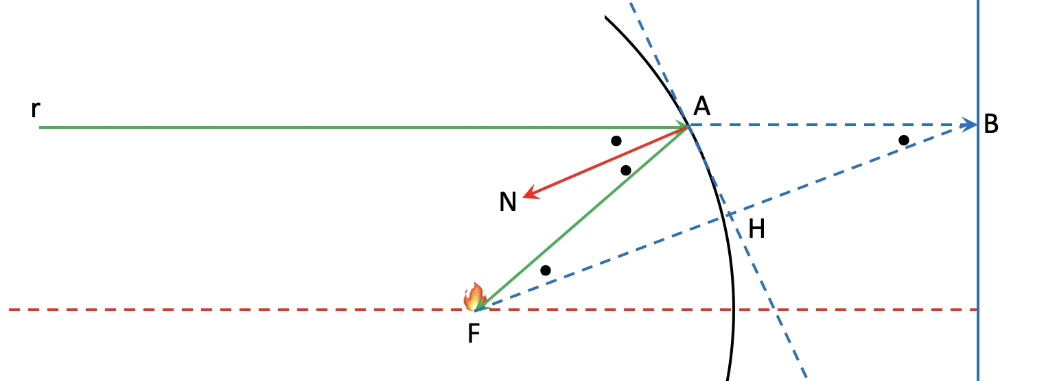 Vero o no che sia stato l’episodio, in via teorica Archimede sapeva certamente che uno specchio la cui forma è descritta dalla rotazione di una parabola intorno al suo asse (il cosiddetto paraboloide di rotazione), quando è illuminato da raggi di luce paralleli al suo asse, ha la proprietà di rifletterli tutti in un punto, detto appunto fuoco (e se vi interessa verificarlo, sappiate che è uno degli esperimenti che io e la mia collega Bianca Salmaso svolgiamo ogni anno nel PCTO “Laboratorio di Ottica”). Ma perché la parabola ha questa proprietà? Perché una parabola è definita come l’insieme dei punti che hanno la stessa distanza dal fuoco e da una retta non passante da esso, detta direttrice. Questa proprietà, attraverso una di quelle costruzioni geometriche in cui i Greci erano maestri (e per cui si disperano tanti nostri studenti…), insieme alla legge della riflessione, permette di ricavare esattamente questo importante risultato. E, se vi interessano i passaggi, li riporto nella didascalia della Figura 1.