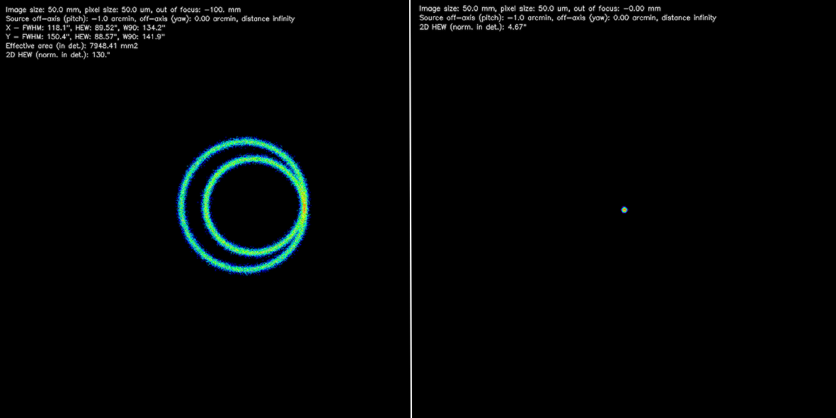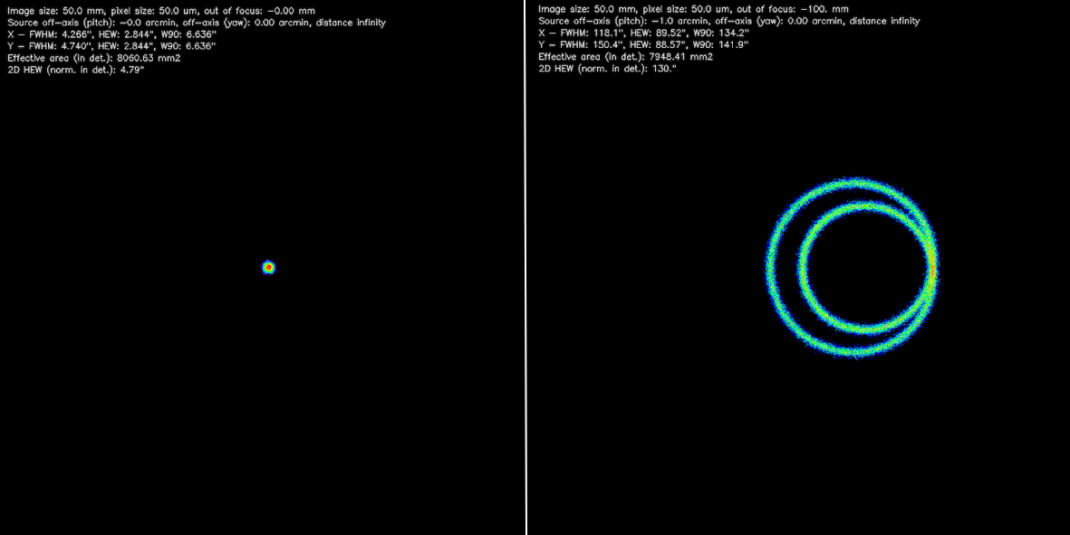 Questo è il più grave (Figura 5): la focalizzazione è perfetta solo quando i raggi sono paralleli allo specchio, ma appena formano un piccolo angolo con l’asse, il fuoco si disperde rapidamente: è la cosiddetta aberrazione di coma. Solo la sorgente al centro del campo di vista del telescopio è a fuoco: tutto il resto risulta sfocato.[2] Detto altrimenti, le immagini astronomiche X che si possono realizzare con un semplice paraboloide in radenza sono minuscole e praticamente senza interesse scientifico.