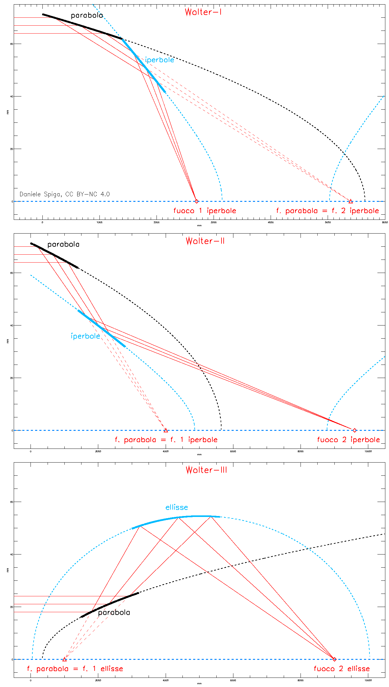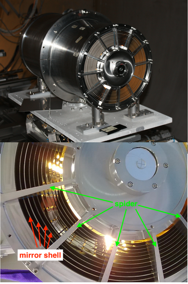 Per completezza, vi descrivo brevemente le altre due geometrie à la Wolter (ancora Figura 7). La Wolter-II è sempre basata su una prima riflessione in una parabola seguita da un’iperbole, ma stavolta la seconda riflessione si verifica sul lato convesso (all’esterno) dell’iperbole, con i raggi riflessi dalla parabola che puntano al fuoco interno dell’iperbole. In tal modo, i raggi vengono concentrati nel fuoco esterno dell’iperbole, cosa che allunga la focale oppure aumenta considerevolmente l’angolo di incidenza, con conseguente riduzione della riflettività, perciò la soluzione Wolter-II non è mai stata utilizzata per realizzare telescopi X. La Wolter-III (sempre Figura 7) è, se possibile, ancora più insolita: stavolta la prima riflessione avviene sul lato convesso della parabola, e in tal modo i raggi riflessi appaiono divergere dal suo fuoco anziché convergervi; si dice allora che il fuoco rappresenta una sorgente virtuale per i raggi. La seconda riflessione si verifica all’interno di uno specchio ellissoidale, di cui uno dei fuochi coincide con il fuoco della parabola, e la focalizzazione si verifica così nell’altro fuoco dell’ellisse. Questa è la soluzione che, al confronto delle altre due, comporta la focale più corta, perciò sarebbe la più vantaggiosa… se non fosse che la peculiare disposizione della parabola rende molto difficile annidare più specchi di questo tipo, quindi questo design è utilizzato raramente, e solamente per focalizzare raggi X prodotti da sorgenti a terra, quali i sincrotroni o i laser a elettroni liberi.